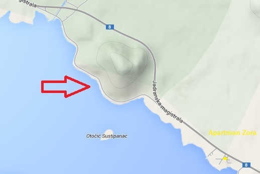 We recommend the first part of the coast (1 km north), opposite the small island Sustipanac. You can drive leisurely on the old coast road where there is almost no traffic. There you can park your car (for free) directly at the sea (see map below).